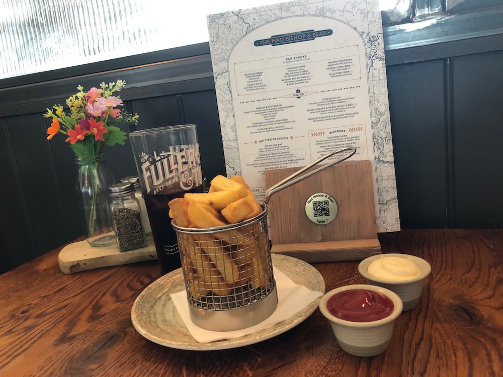 Look for the "Mad Bishop & Bear" pub upstairs, above all the shops and supermarkets. Grab a table number and order at the bar. Enjoy!